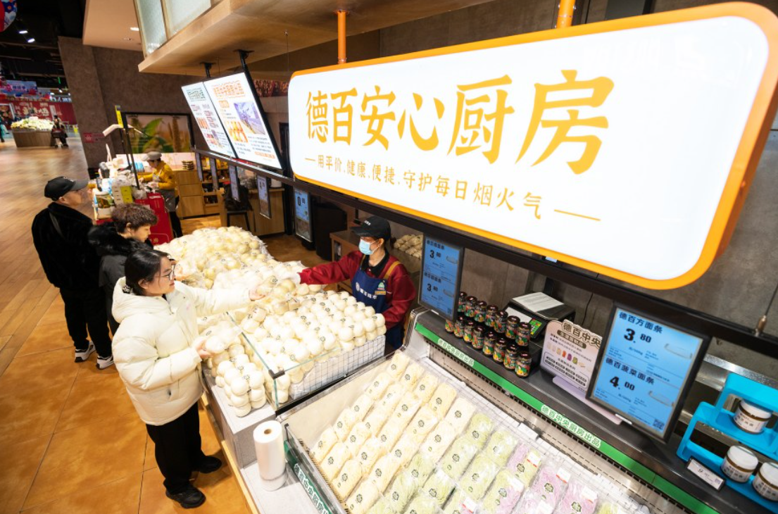 澳德樂商場(chǎng)負(fù)一層超市,一銷售饅頭、面條的專柜前,標(biāo)識(shí)牌上醒目地寫著:德百中央廚房出品,德百自營(yíng),好食材匠心造。幾步之遙,熟食區(qū)的豬蹄、雞爪,以及更遠(yuǎn)處蔬菜區(qū)的豆芽,與這些面條、饅頭一樣,都來自德百中央廚房。