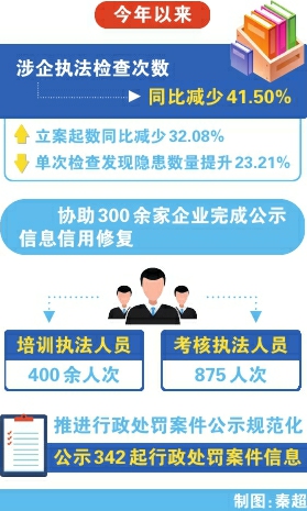 原標(biāo)題:全市涉企檢查次數(shù)同比減少41.50%,單次檢查發(fā)現(xiàn)隱患數(shù)量提升23.21%—— 監(jiān)管精準(zhǔn)化 執(zhí)法規(guī)范化