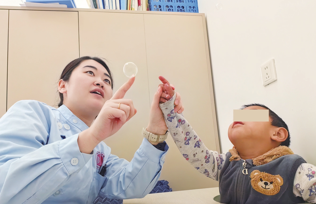 康復(fù)治療師通過引導(dǎo)孩子指認(rèn)肥皂泡,進(jìn)行感覺統(tǒng)合訓(xùn)練。記者唐志梅攝