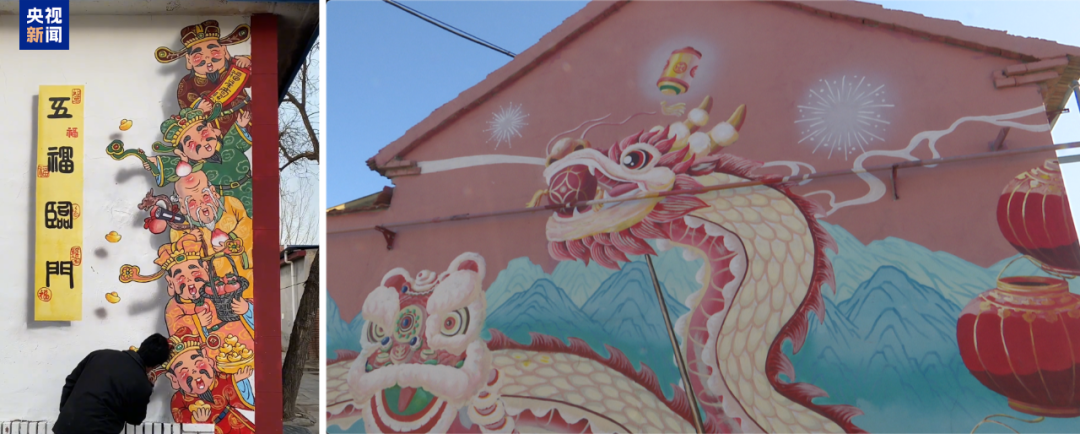 這些年,每逢春節(jié),沈靖宇都會用墻畫裝扮家鄉(xiāng)。去年,他在墻壁上畫上了生肖龍,今年,他又創(chuàng)作了“五福臨門”等作品。