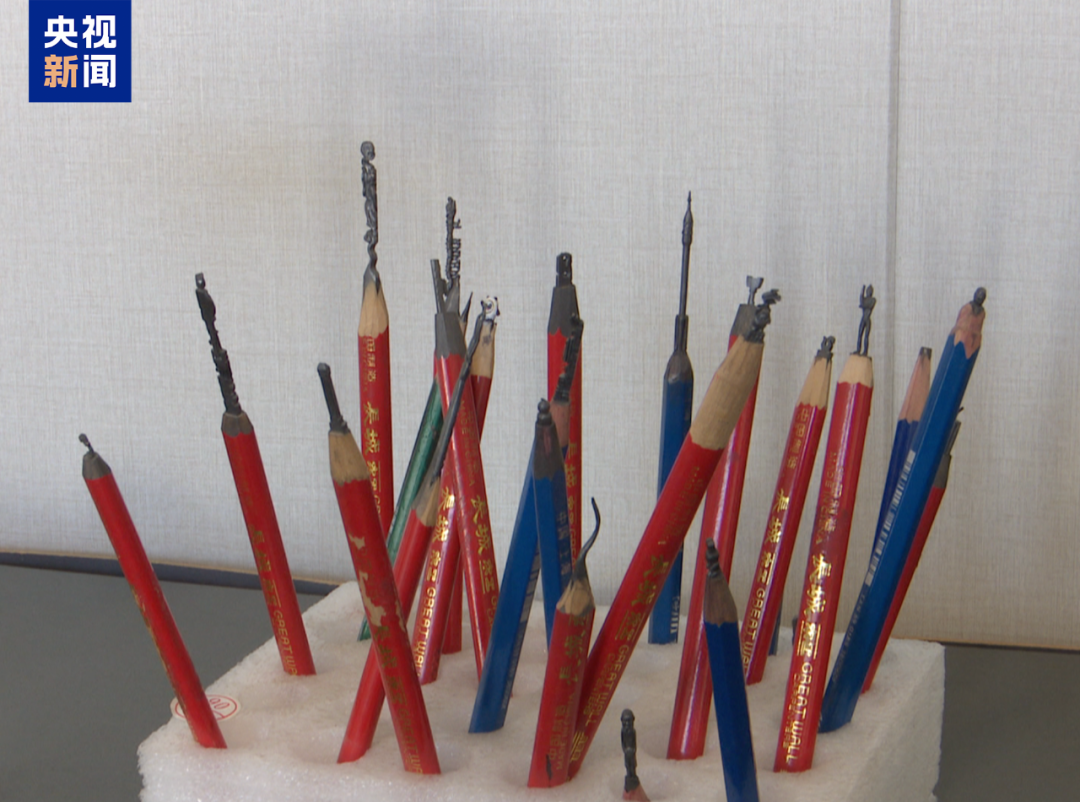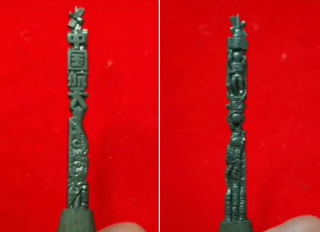 完成一件微雕作品少則幾個小時,多則數(shù)天。令沈靖宇印象最深刻的是一個航天主題的微雕作品:一面是“中國航天”字樣,另一面是三個身著太空服的航天員,細(xì)看上面還有國旗、火箭等元素,這些全被雕刻在了5毫米的鉛筆芯上。