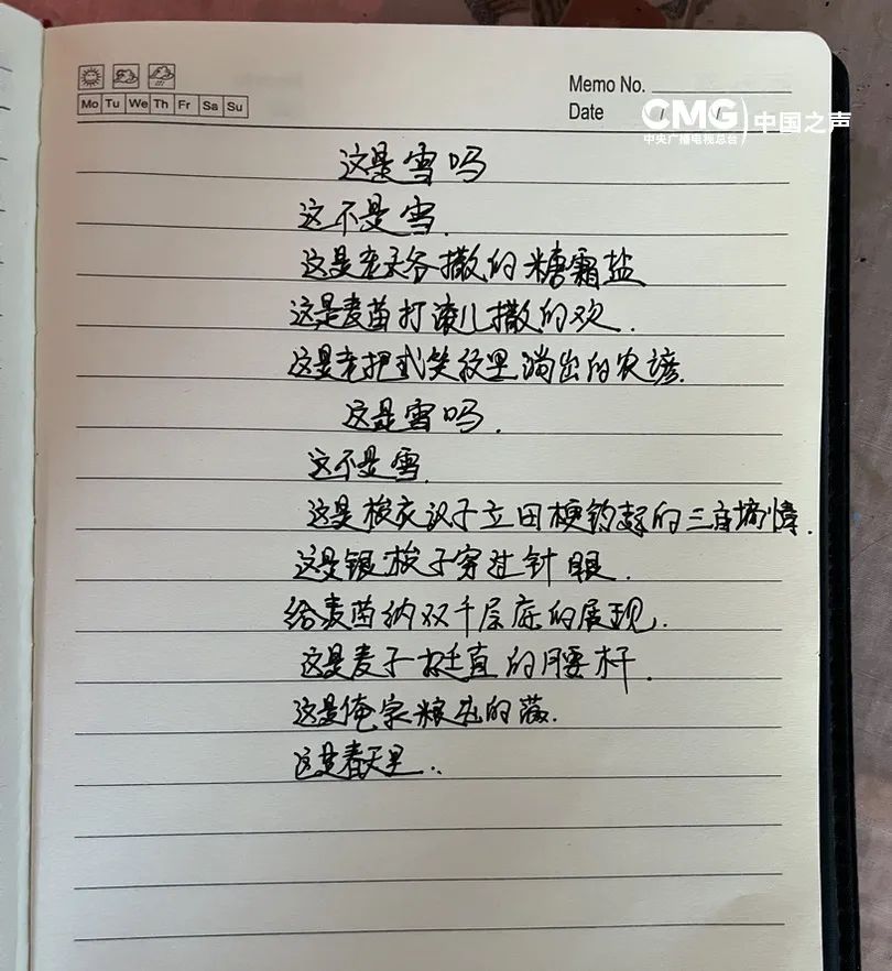 沒有濾鏡,沒有美顏,視頻里的“二姐”素面朝天,穿著最家常的小方格棉衣,右手托著一把剛下的春雪,笑盈盈地讀著剛寫完的詩。“我的家鄉(xiāng)一個冬天都沒下雪,一看下了雪,我說麥子有救了,麥子有救了呀!我躺在被窩里沒起,就在那兒寫。”一寫完,呂玉霞裹上棉衣揣起手機就往雪地里跑,早飯都顧不得吃,“就怕雪化了”。