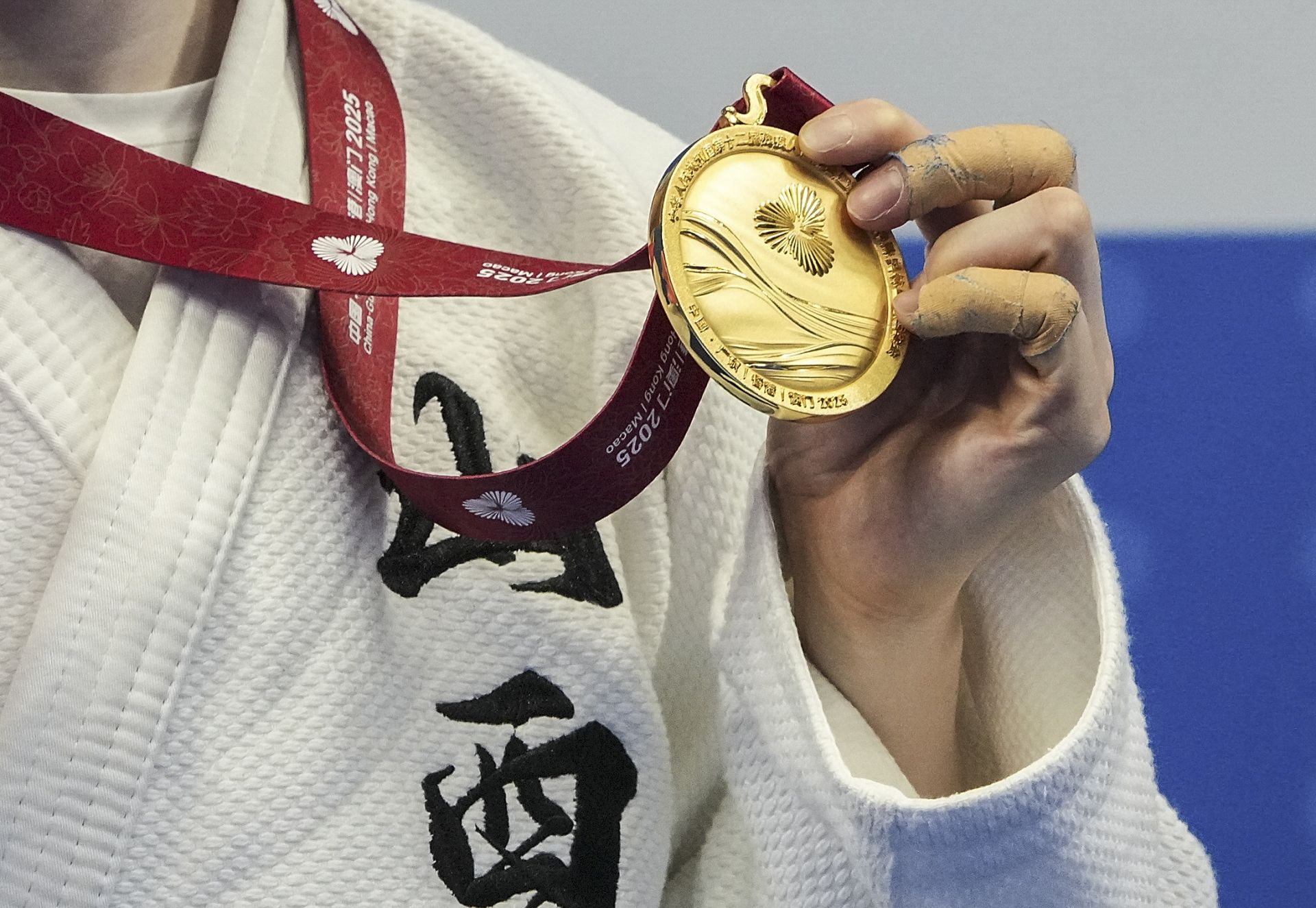 12月10日,冠軍山西隊選手王嘉楠在盲人柔道女子J2-60公斤級比賽頒獎儀式上展示金牌。