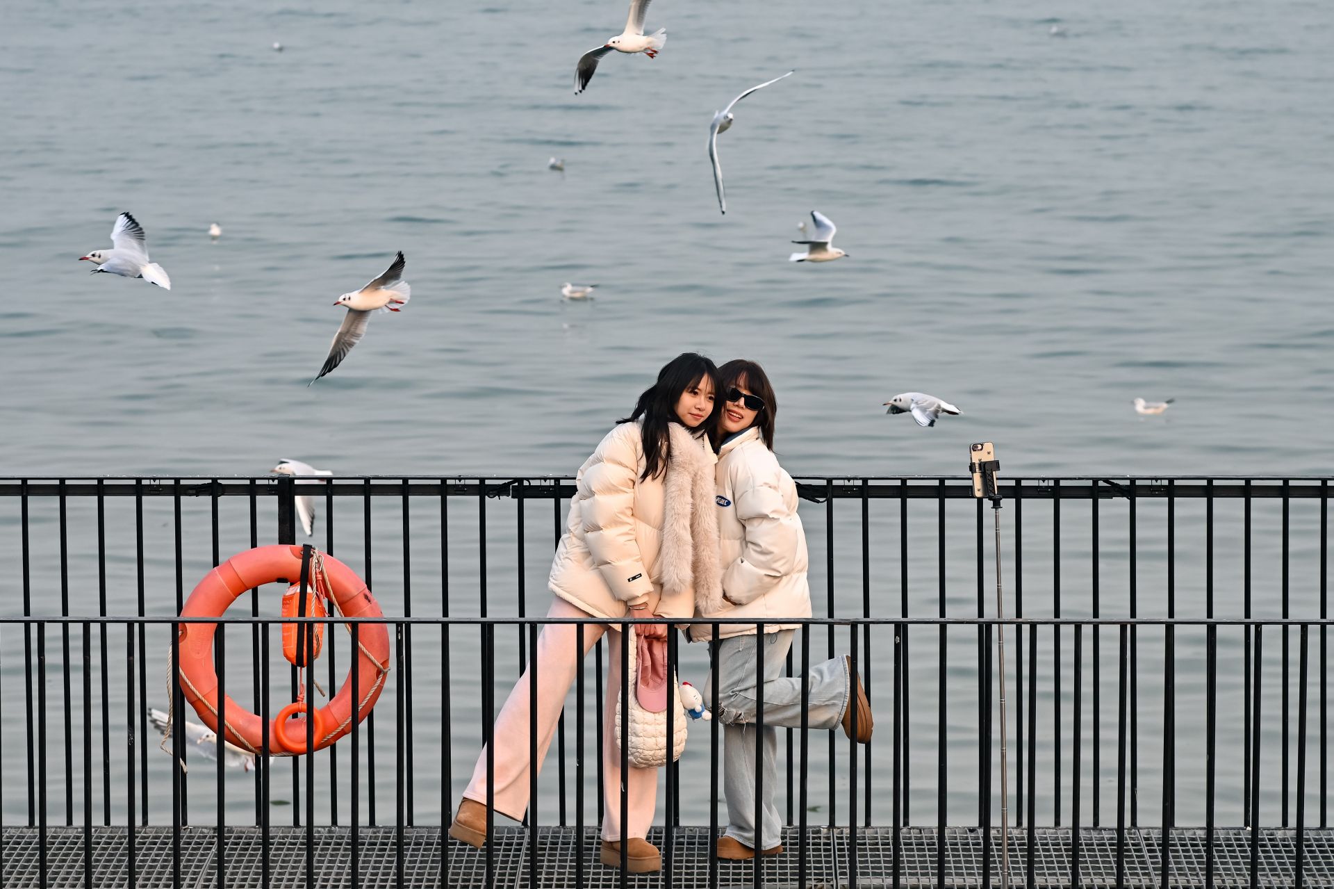 冬日,在天津市濱海新區(qū)的海貝樂園,成群的海鷗在此聚集棲息,吸引眾多游人前來喂食、賞趣。