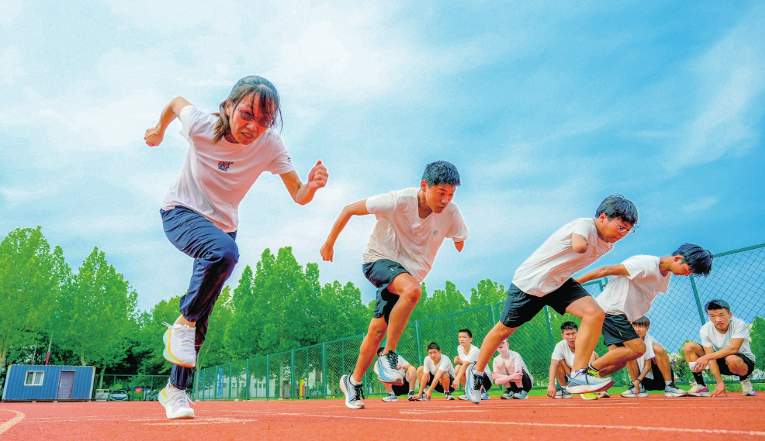 運動場上,王玉芹(左一)給學員示范起跑姿勢