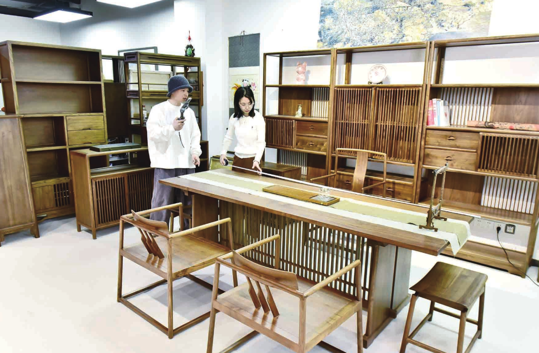禪心木業(yè)公司銷售人員線上為顧客展示產(chǎn)品。記者胡兵攝